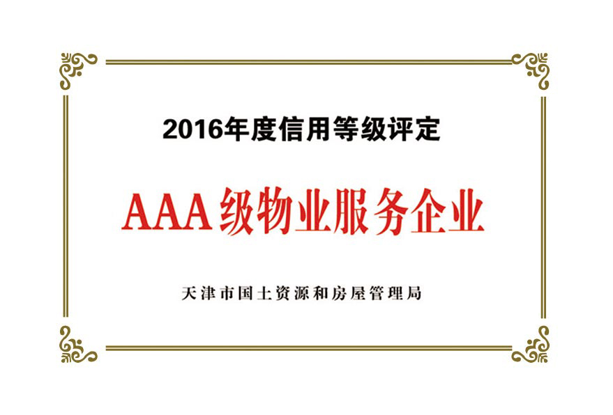公司目前被授予:中國保安協(xié)會理事單位、物業(yè)管理綜合實(shí)力入圍企業(yè)、天津市物業(yè)協(xié)會理事單位、天津市保安協(xié)會常務(wù)理事單位、天津市保潔協(xié)會明星企業(yè)、天津市科技小巨人企業(yè)、天津市科技型企業(yè)、天津市物業(yè)管理企業(yè)優(yōu)秀項(xiàng)目經(jīng)理、企業(yè)信用評價體系A(chǔ)AA級企業(yè)、AAA級誠信經(jīng)營示范單位、AAA級重合同守信用單位、2017年被天津市工商業(yè)聯(lián)合會評為天津市民營企業(yè)促進(jìn)就業(yè)百強(qiáng)企業(yè)、社會捐贈百強(qiáng)企業(yè)、2018年銷售收入百強(qiáng)企業(yè),2020年被天津市退役軍人事務(wù)局評為天津市吸納退役軍人就業(yè)先進(jìn)單位。